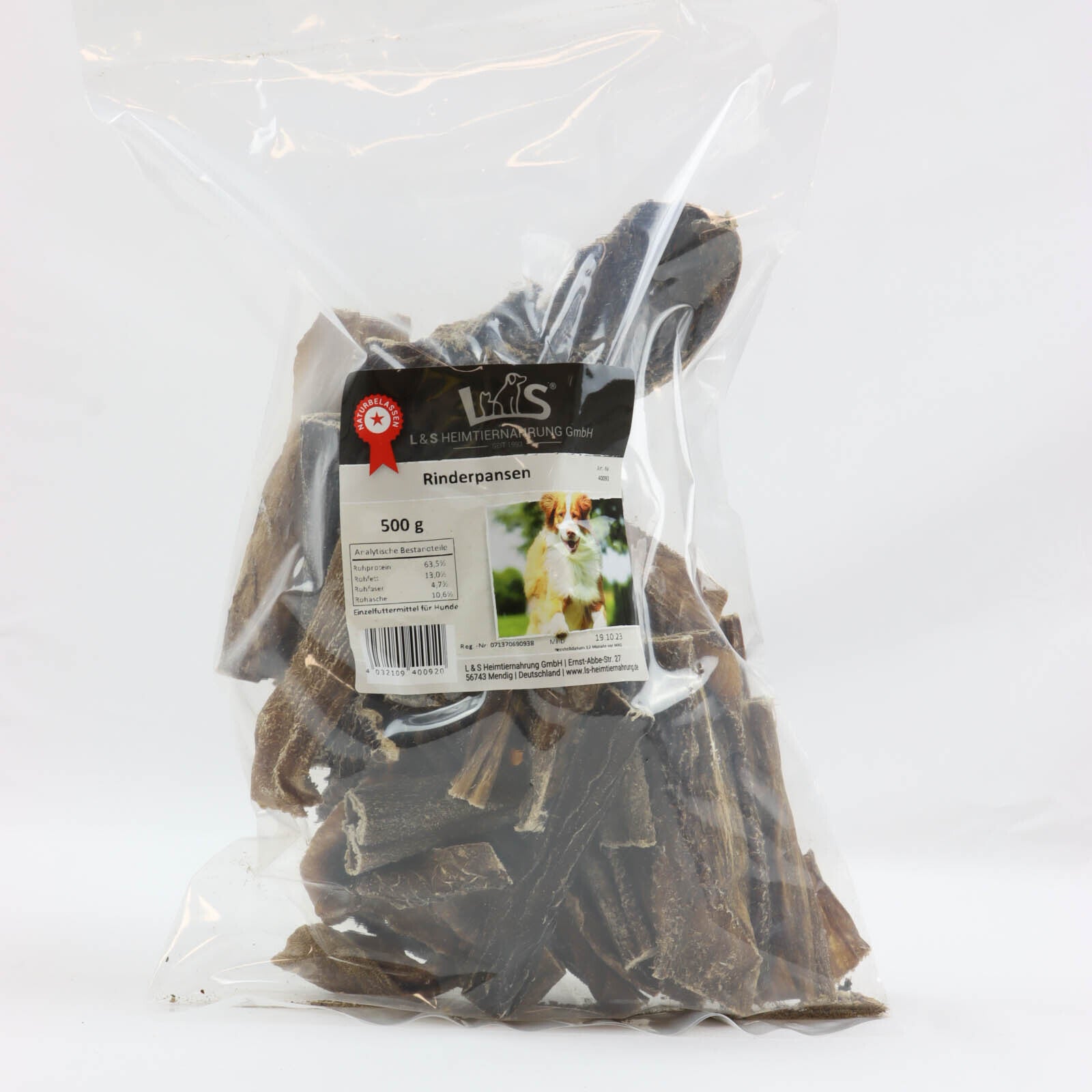 Verpackungseinheit: BeutelZusammensetzung: Pansen vom Rind, getrocknetAnalyse: Rohprotein 63,5%; Rohfett 13%; Rohfaser 4,7%; Rohasche 10,6%Fütterungsempfehlung: Als Kausnack oder Belohnung zusätzlich zu den regulären Mahlzeiten füttern. Frisches Trinkwasser sollte immer bereitstehen. Wir empfehlen Snacks und Kauartikel nur unter Aufsicht zu verfüttern!